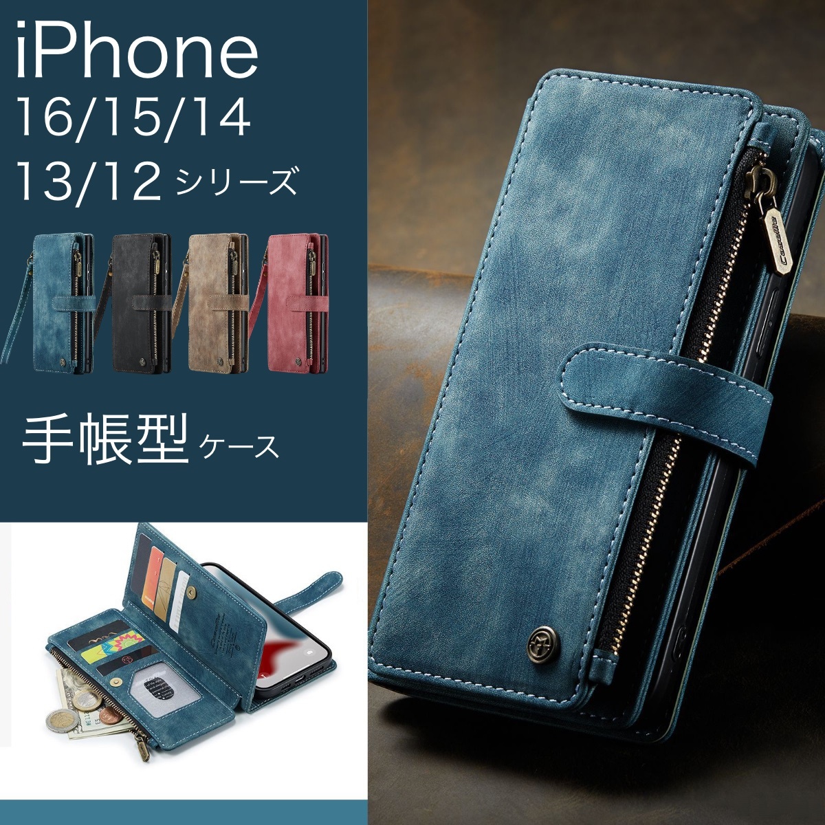 - iPhone12/12Pro(兼用) ケース ネイビー 手帳型 お財布 携帯 カバー カード 収納 マグネット スマホケース 16 15 14 13 12 Max Pro S2C009