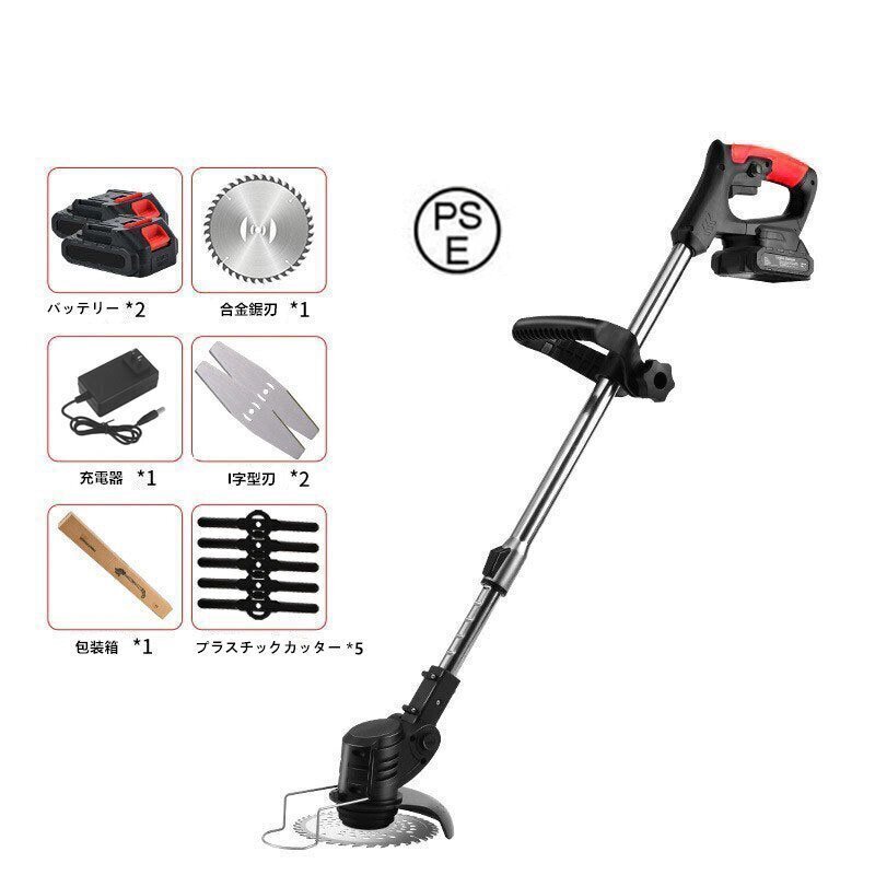 充電式芝刈り機 1台、大容量バッテリー 2個、ナイロン刃 5枚、スチール刃 2枚、充電器 1個、合金鋸刃 1枚、英語取扱説明書 1部。