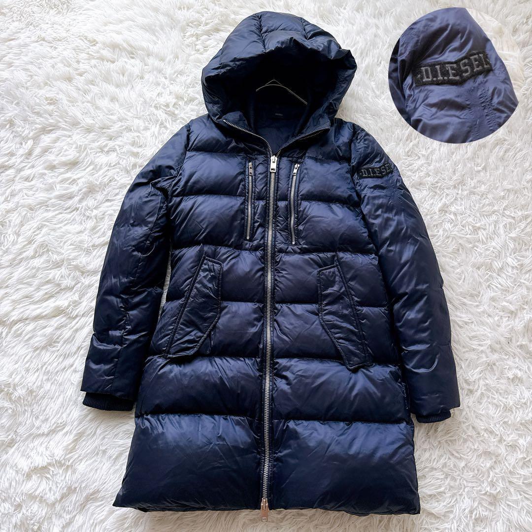 - DIESEL ディーゼル ロングダウンジャケット ロゴワッペン フード付 ネイビー Sサイズ アウター 防寒 軽量 保温 高級 アウター ブルゾン