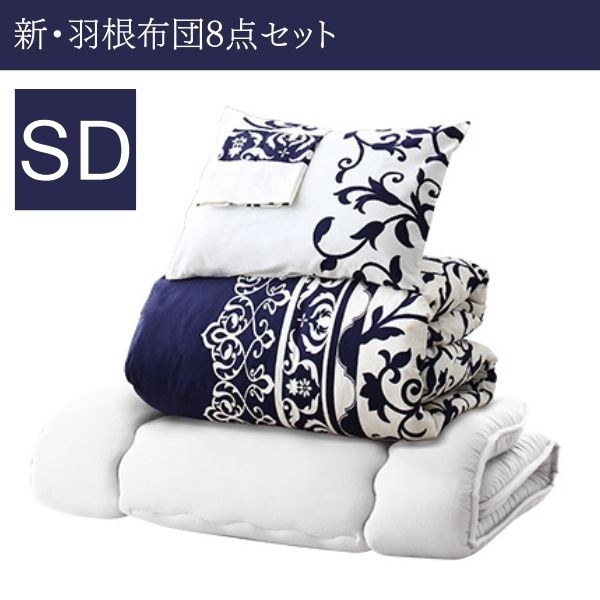 - 3年保証 新・羽根布団8点セット 和タイプ セミダブル 地中海リゾートネイビー