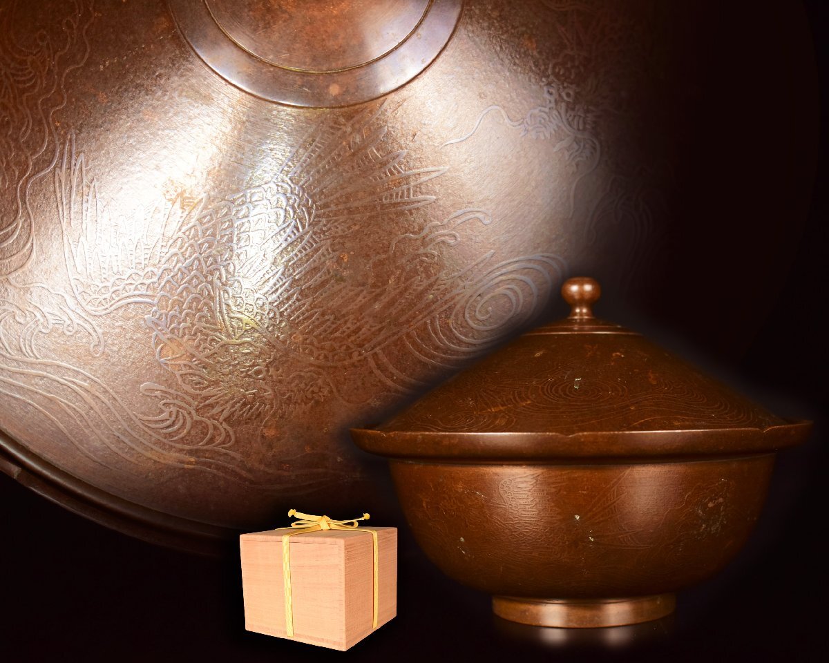 X638 【泉美】南支製 銅製 飛龍紋 蓋物 菓子器 木箱入拍卖