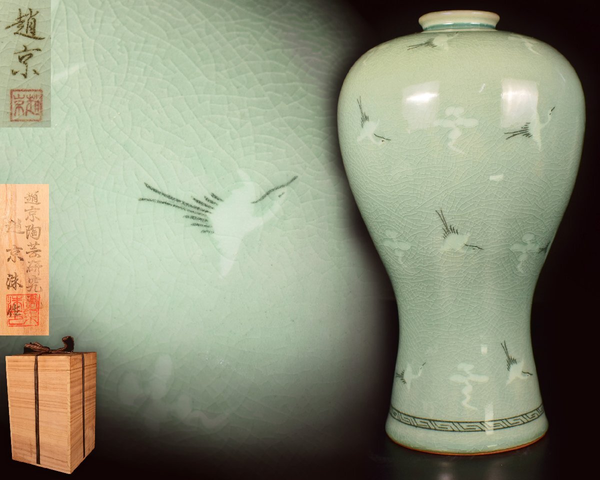 X795 【泉美】趙京陶芸研究院 趙京洙作 雲鶴紋 高麗青磁 花瓶 花器 花入 共箱入拍卖