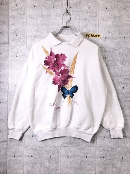 - レディース 花と蝶 ラメプリント 襟付き 裏起毛 スウェットトレーナー 白