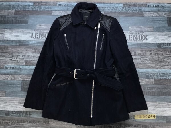 > FOREVER 21 フォーエバー レディース ベルト付き メルトンウール混 ジップコート 切替合皮レザー M 紺