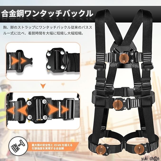 - ハーネス 安全帯 ブラック フルハーネス Lサイズ 新規格 墜落制止用器具 伸縮式ダブルランヤード ワンタッチバックル 肩パット付