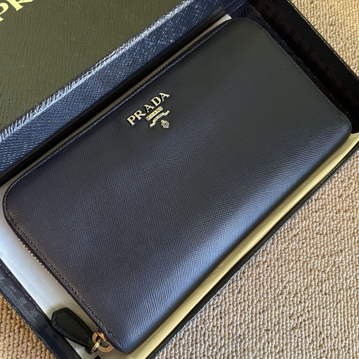 - 一円 美品 PRADA プラダ 長財布 ウォレット サフィアーノレザー 財布 ラウンドファスナー レザー ネイビー