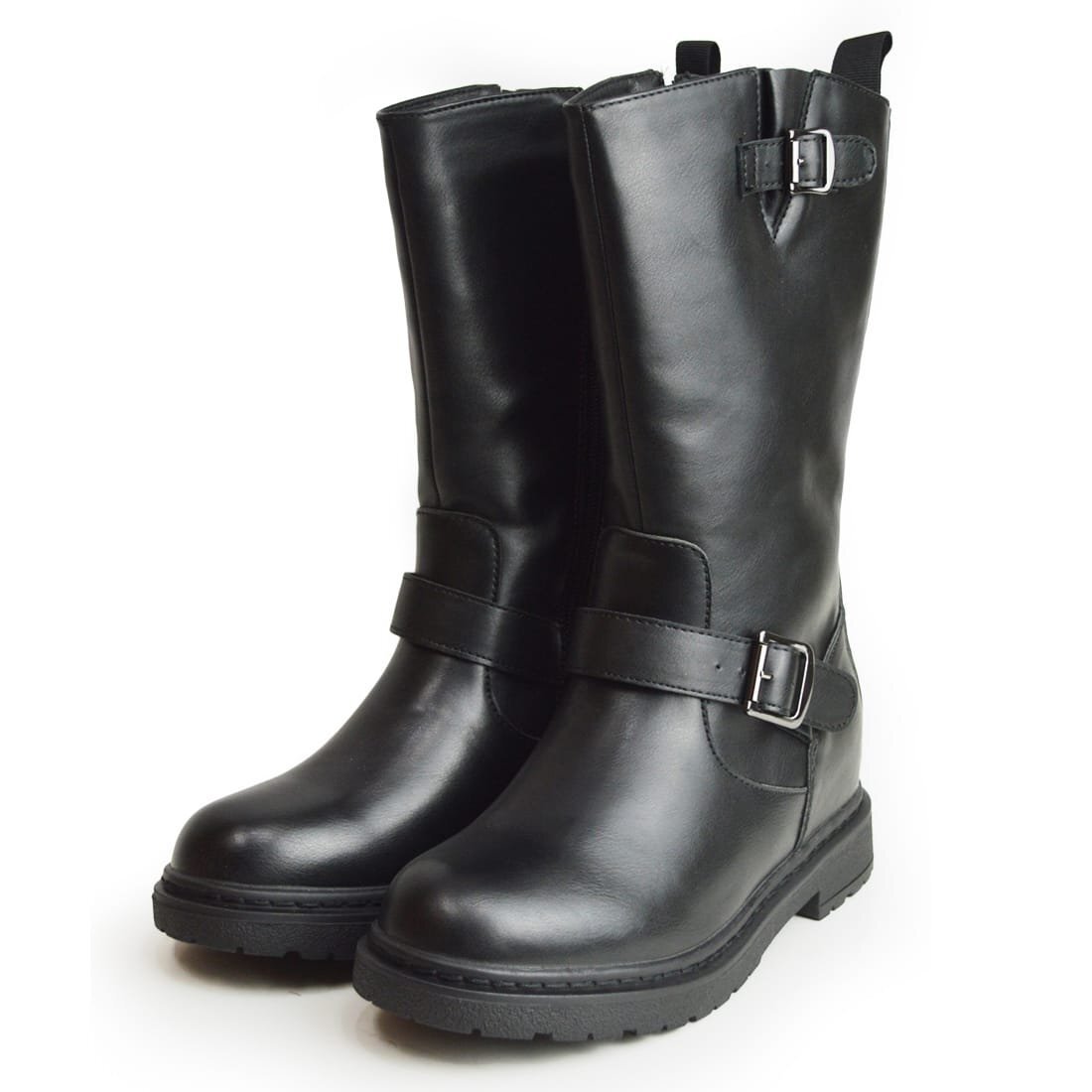 > 新品■25.5cm レディース エンジニア ブーツ 6cm インヒール ロングブーツ バックル ベルト サイドジップ ミドル丈 脚長 防滑 低反発 靴