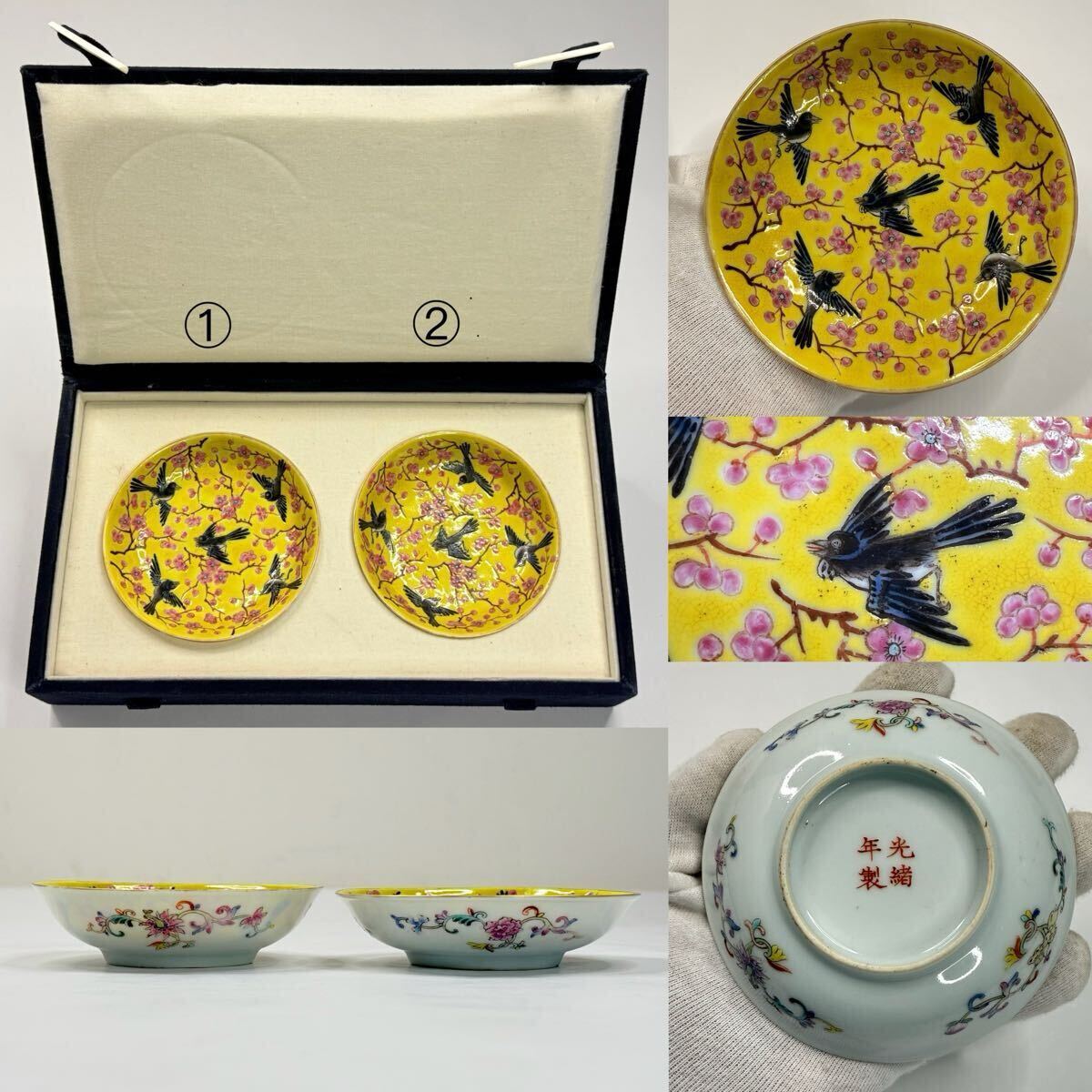 - RR-中国古美術 時代物 色絵 粉彩 皿 小皿 花鳥図 ペア 在銘 光緒年製 共箱付 唐物 陶磁器 中国古玩 骨董品