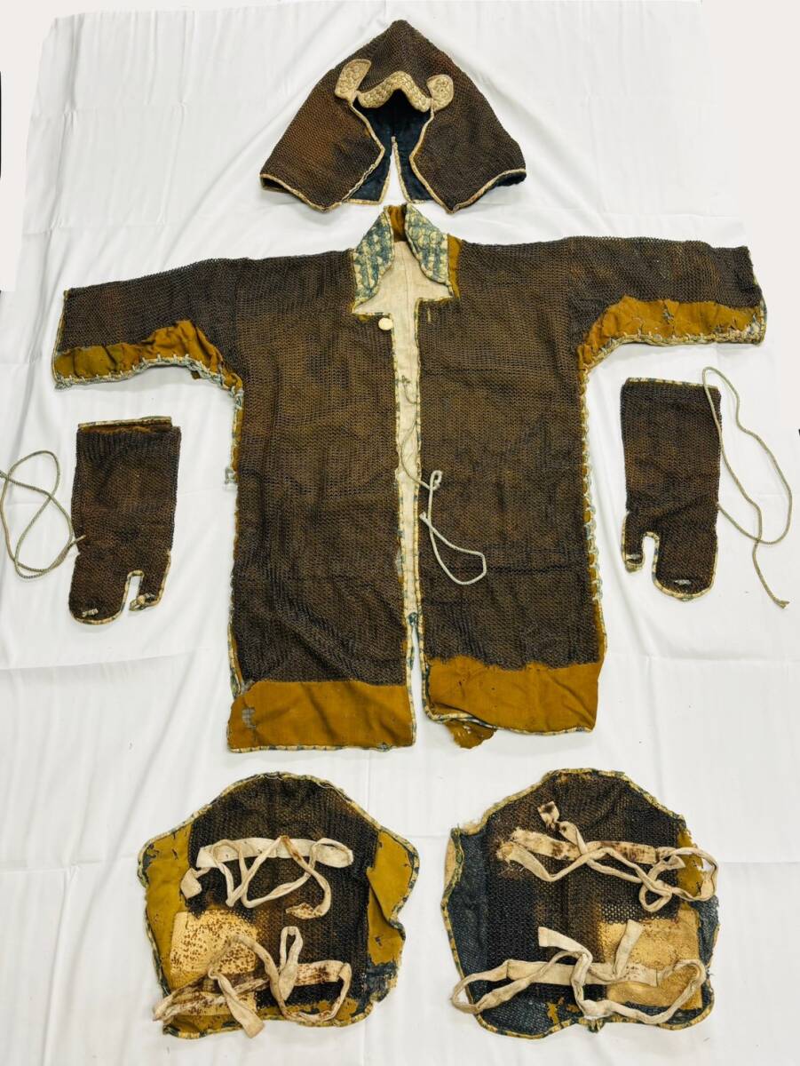 > 【希少 時代物】鎖帷子 一式 頭巾 胴着 手甲 脚絆 武具 甲冑 武士具 江戸期 鉄製 鎖かたびら 骨董品 飾物 時代物 古武具 長崎買取 現状