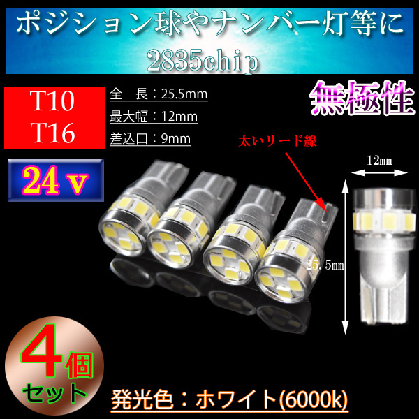 - 24V車用 4個 T10 T16 6w 2835SMD 12連 車検対応 バス ダンプ 大型車 トラック 車幅灯 ナンバー灯 ポジ球 ホワイト 24v