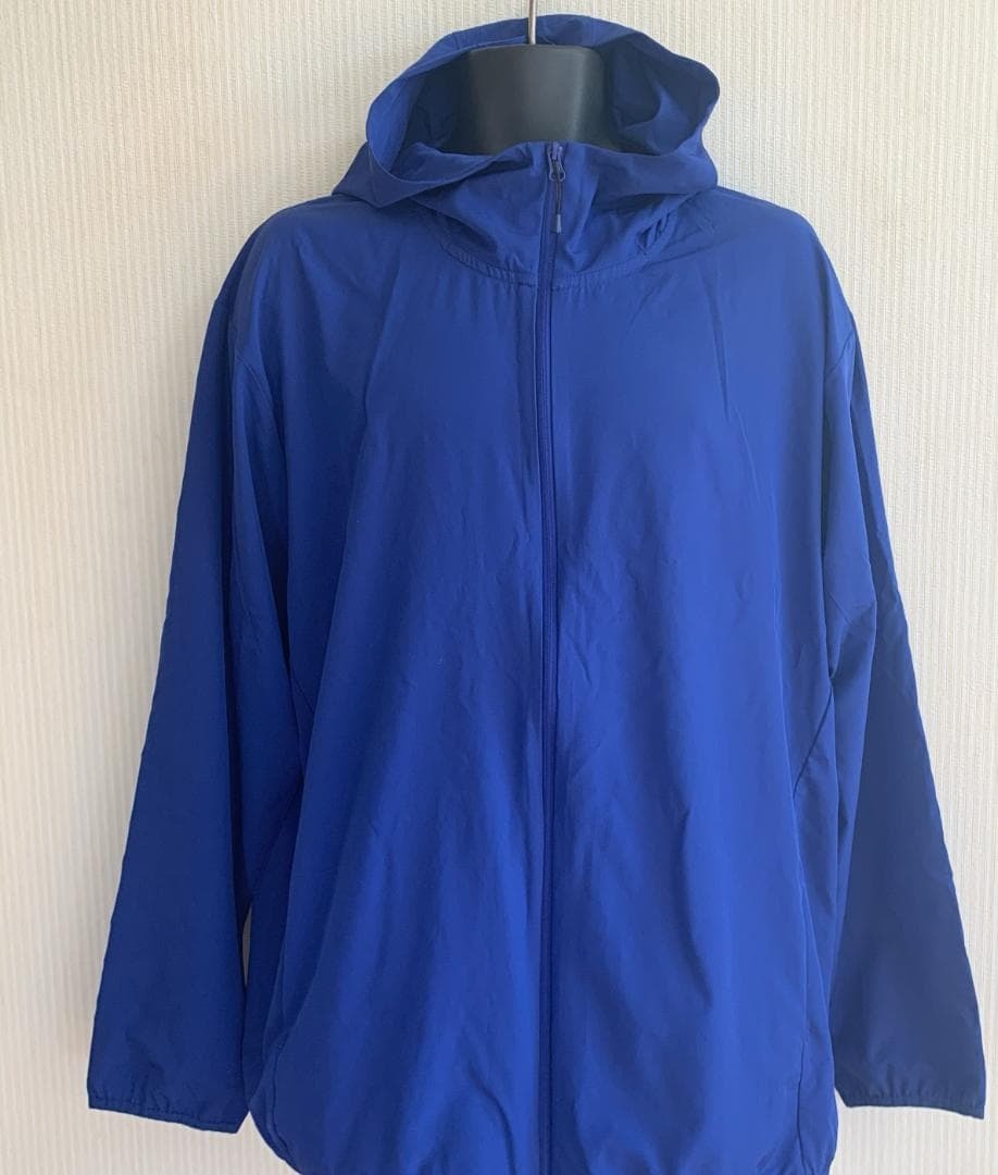 - 中古美品 青のフード付きジップアップパーカー 5L メンズ 薄い素材 重ね着に