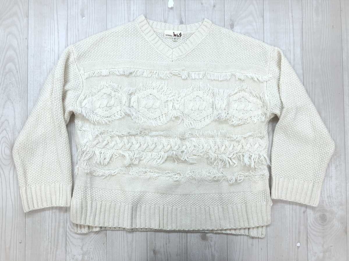 > チチカカ TITICACA 民族エスニック フォークロア Vネック フリンジ ケーブル編み ジャガードニット セーター レディース F 白
