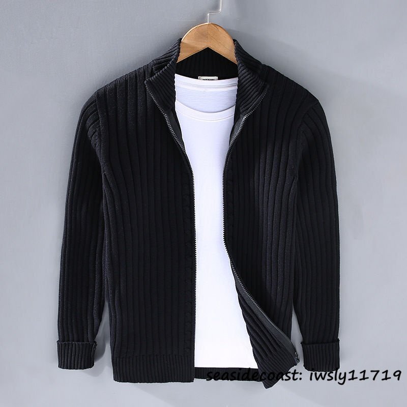 > 秋冬新作*ニット セーター メンズ 厚手 ニットジャケット トップス 長袖 アウター プルオーバー ハーフジップ コットン ブラック L