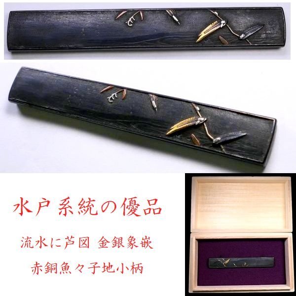 > 【 恵 #1922 】 水戸系統の優品 「流水に芦図」金銀象嵌 赤銅魚々子地小柄 趣深き一品です 検:鍔/縁頭/切羽/ハバキ/刀剣/刀装具