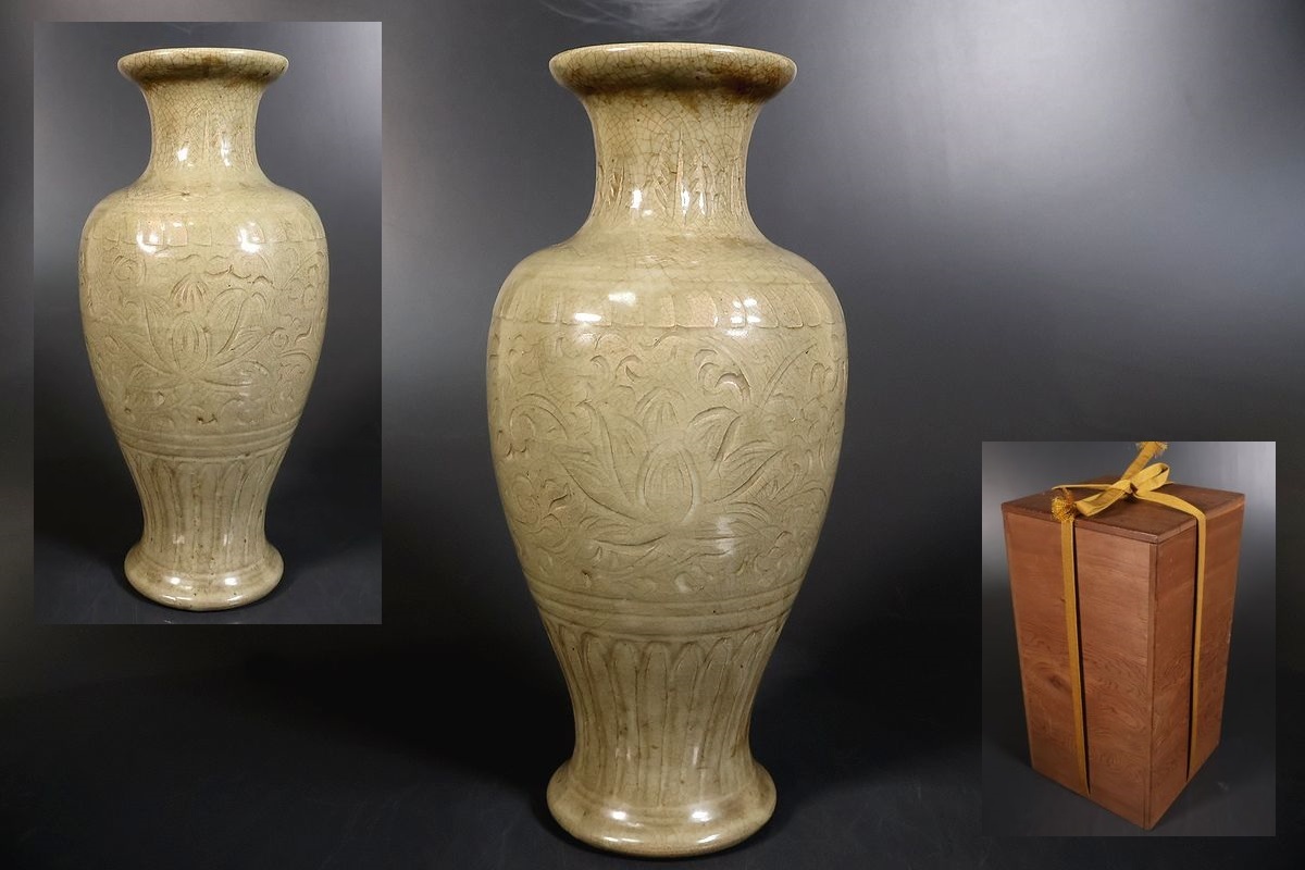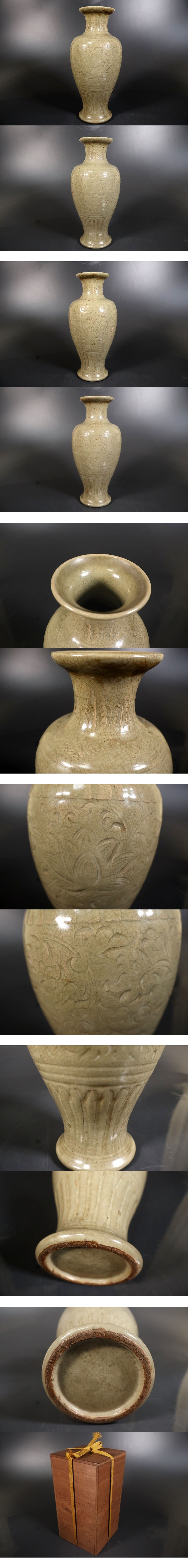- 【小】5370 中国古美術 唐物 龍泉窯青磁花文花生 花瓶 保管箱有 牡丹文印刻文