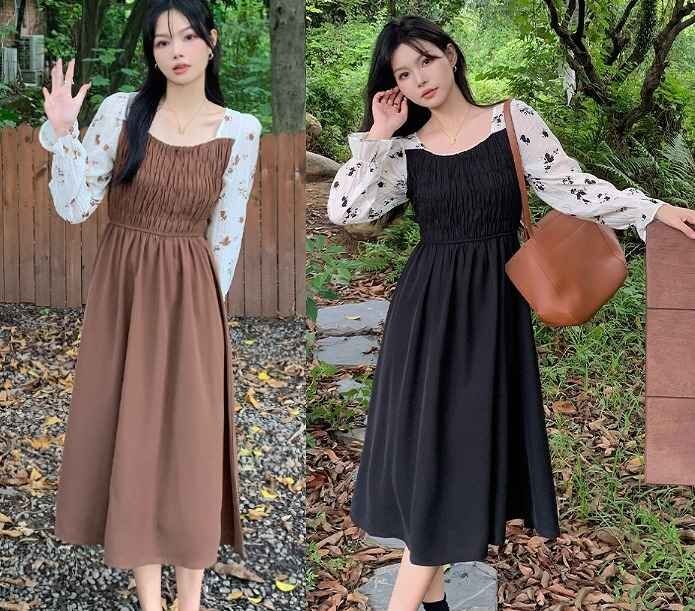 - 全2色 長袖ワンピース フリル 切り替え バイカラー スリム 着痩せ 【大きいサイズあり】 sweet系 XL ブラック