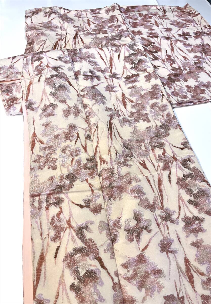 > 花とら●リサイクル着物 お召し マジョリカお召? ベージュ 花柄 着用可能 三越扱い リメイク 素材 細工用 251105