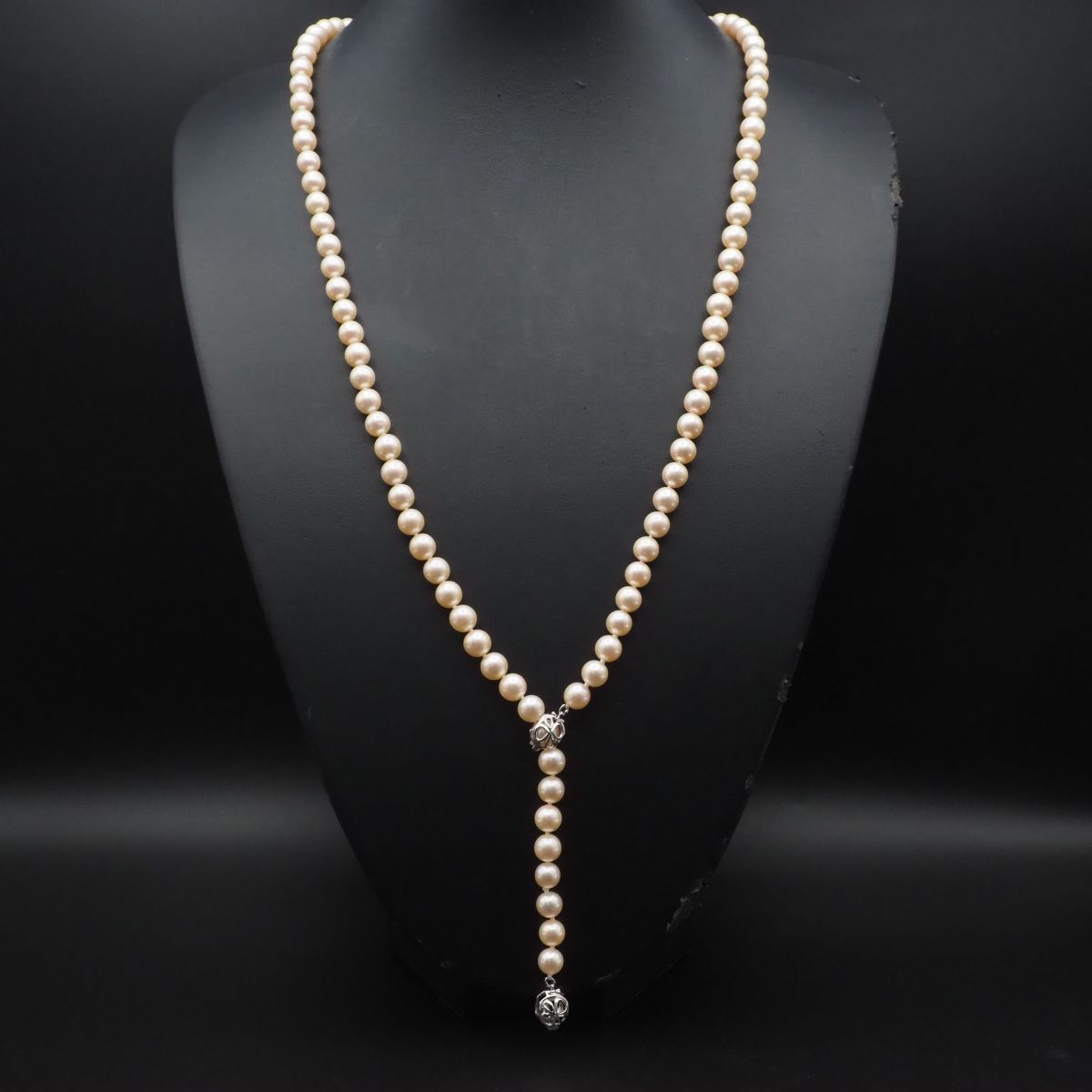 - H245 本真珠 7.6mm珠 パール SV刻印 ラリエット ネックレス デザイン シルバー 6月誕生石