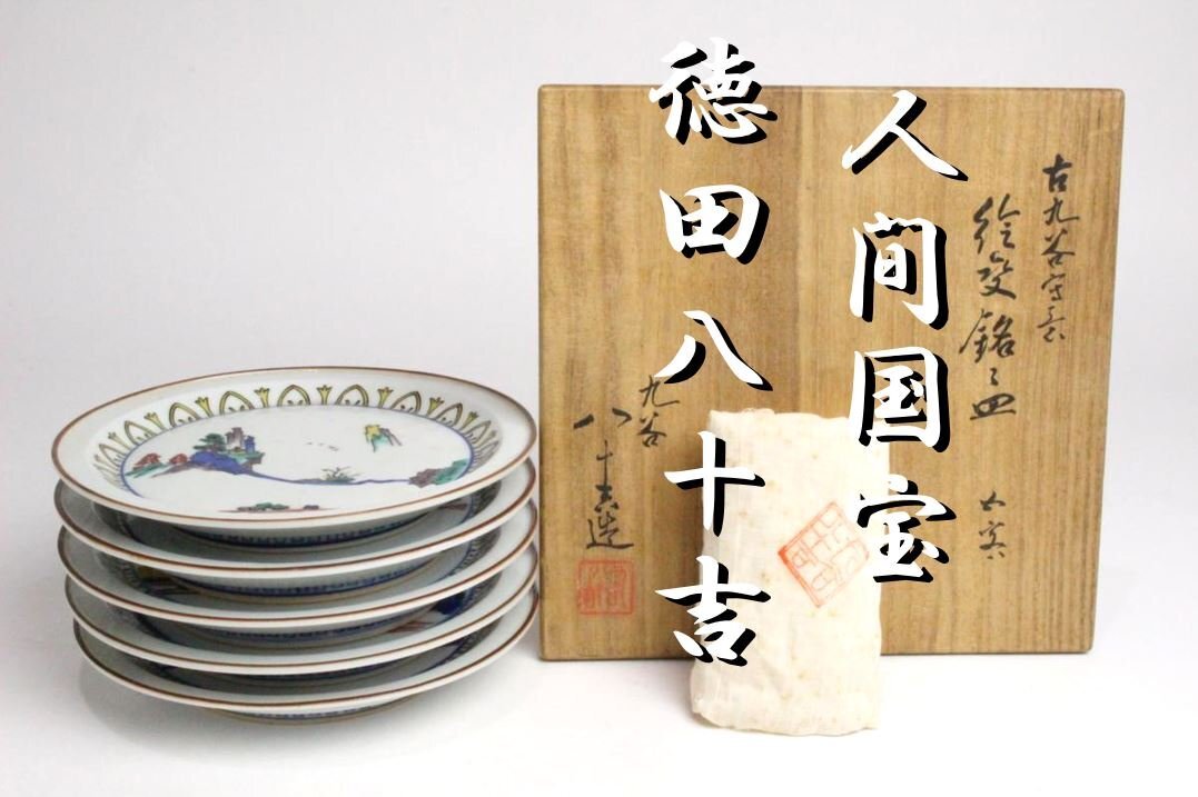 初代 徳田八十吉 作の古九谷写絵変銘々皿 5客 「共箱・共布」