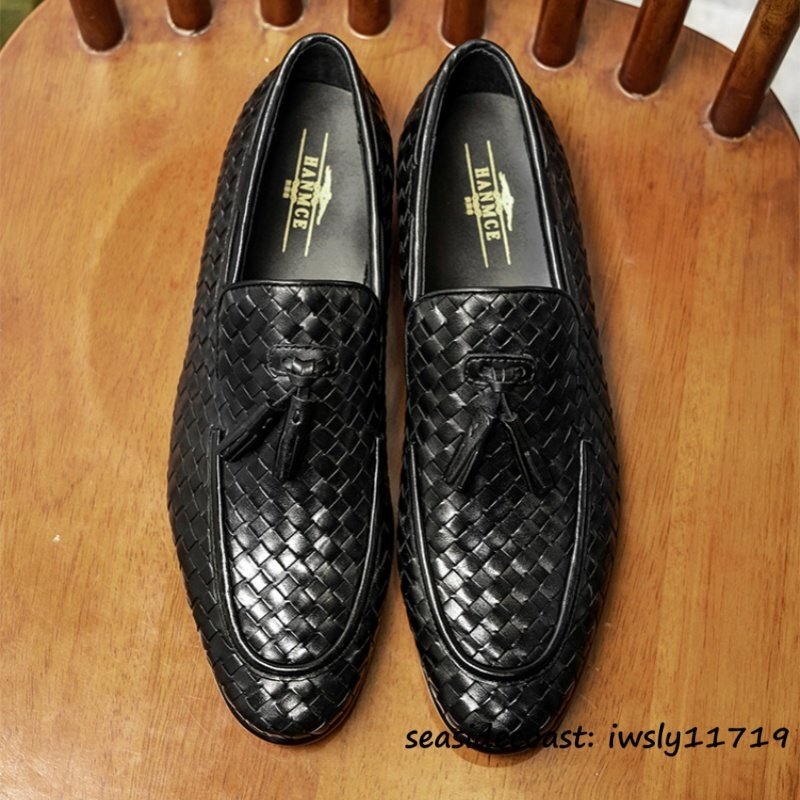 - 最上級■定価12万 スリッポン 本革 ビジネスシューズ 職人手作り 編込み レザーシューズ タッセル ローファー 牛革 紳士靴 ブラック 24.5cm