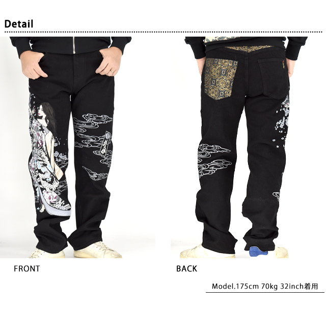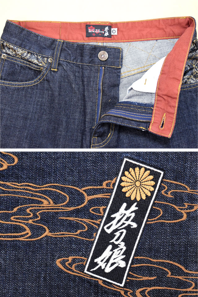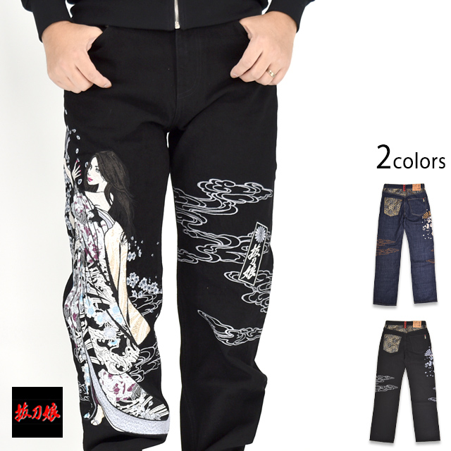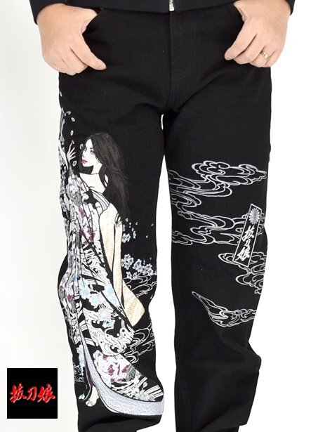 > 抜刀娘 結愛花魁デニムパンツ◆抜刀娘 ブラック 40inch 40インチ 254248 和柄 和風 刺繍 ジーンズ 着物 桜 さくら