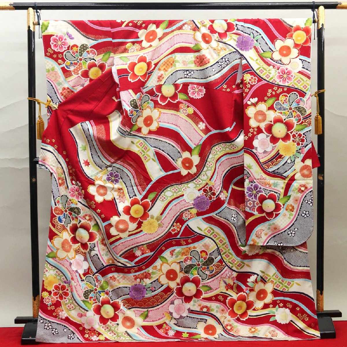 ※こちらの商品はお仕立て上がりでございますので、 商品の到着後すぐにお召し頂けます。 特別な日にふさわしい、お仕立上がりのお振袖をご紹介いたします。 桜の地紋入りのオフホワイト色の八掛がついております。 しっとりとした生地は、赤色でございます。紗綾形に小花模様の地紋が施されております。 白色や黄色、赤色、ピンク色、水色、鉄紺色、オレンジ色などの色彩で、緩やかな波のような模様や梅が染められております。 華やかな印象のお着物でございます。 <寸法> ・身丈(背から):約168cm ・袖丈:約115cm ・裄:約68cm(肩幅:約35cm、袖幅:約33cm) ・前幅:約25cm ・後幅:約30cm ・広衿(スナップ付き) -状態・素材:新品 お仕立て上がり 正絹 -落款・証紙: