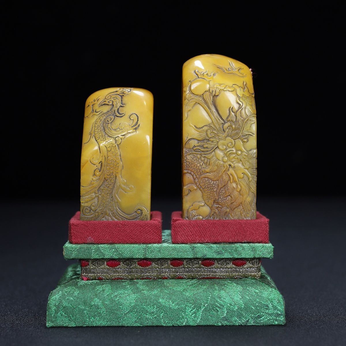 - 永し 清時代 壽山田黄石彫 龍鳳呈祥紋 印章 手彫り 印鑑 印璽 極細工 置物擺件 古美術品 時代物 古董品 収集 旧家蔵出 中国唐物 242g