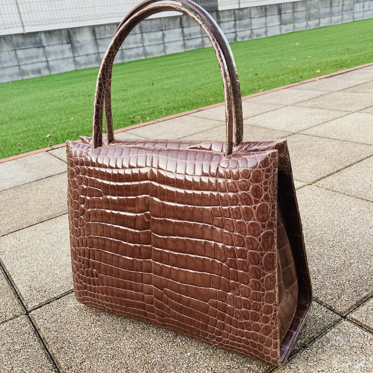 > ★即決★ クロコダイル クロコ 鰐革 ワニ ハンドバッグ センター取り シャイニング シャイニー スモーキーブラウン 茶色 BR
