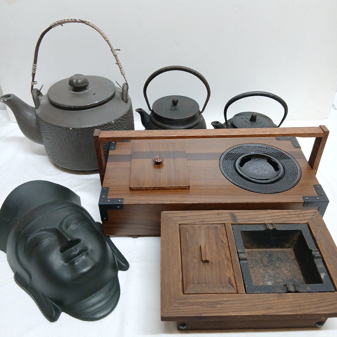 - 南部鉄器 灰皿 煙草盆 木製 鉄器 骨董品 古民具 弥勒菩薩 仏教美術 鉄製 鉄瓶 急須 茶道具 アラレ 金属工芸 サビ有り 中古保管品