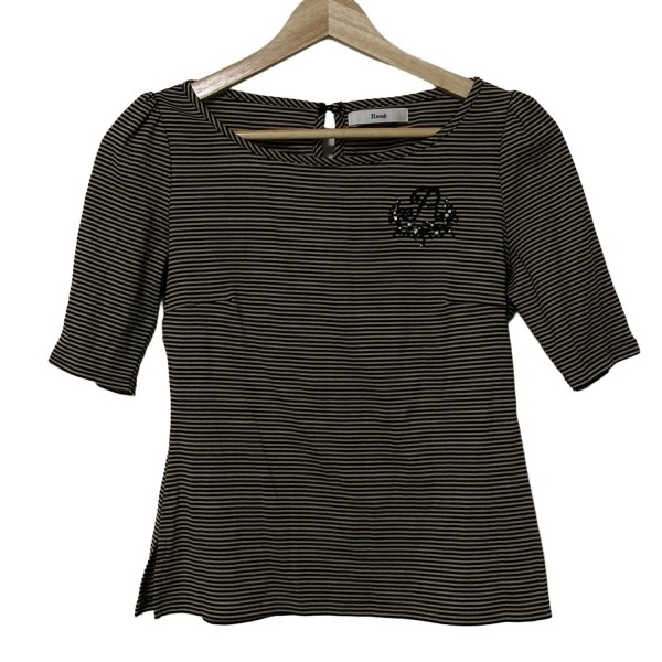 > ルネ Rene 半袖カットソー サイズ36 S - グレーベージュ×黒 レディース クルーネック/ボーダー/刺繍/パール/ラインストーン/ビーズ/Relax