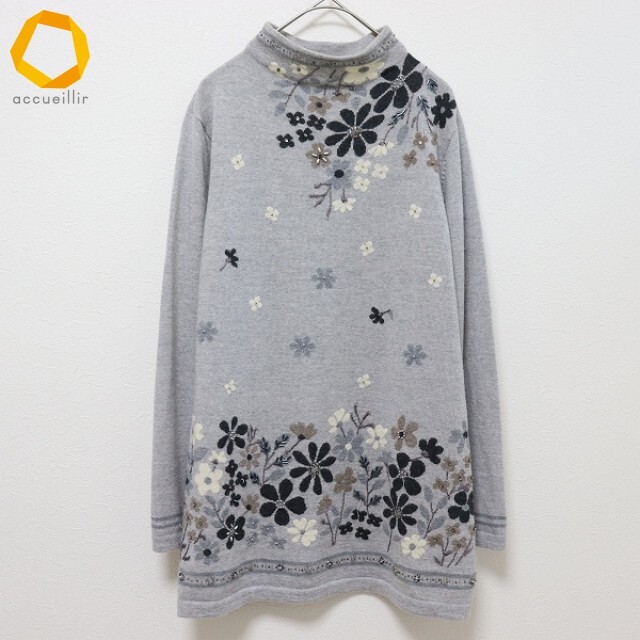 - アトリエサガン ATELER SAGAN ウール ニット チュニック トップス ハイネック ビーズ パール スパンコール 花柄 [x977601n]
