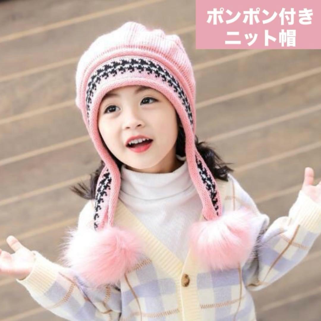 - キッズ ニット帽 帽子 ぽんぽん かわいい 防寒 ピンク 親子コーデ
