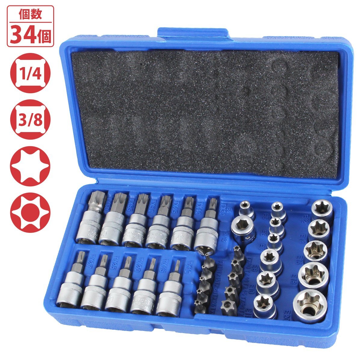 > トルクスソケット 花型 星型 E型 1/4 T型 3/8 いじり止め ソケットレンチ 34pcs セット トルクス ドライバー レンチ ソケット