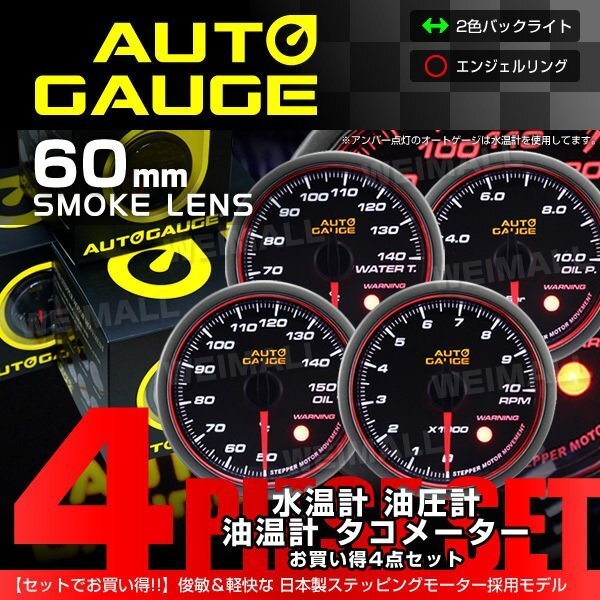 - 【4点セット 水温計/油温計/油圧計/タコメーター】オートゲージ セット 60mm 458 60Φ 追加メーター 計器 エンジェルリング ワーニング