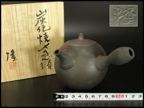 > 【銀閣】笠間焼 名工 黒田隆 作 特級 急須 共箱 焼締 横手 未使用 旧家蔵出 送料無料(A454)