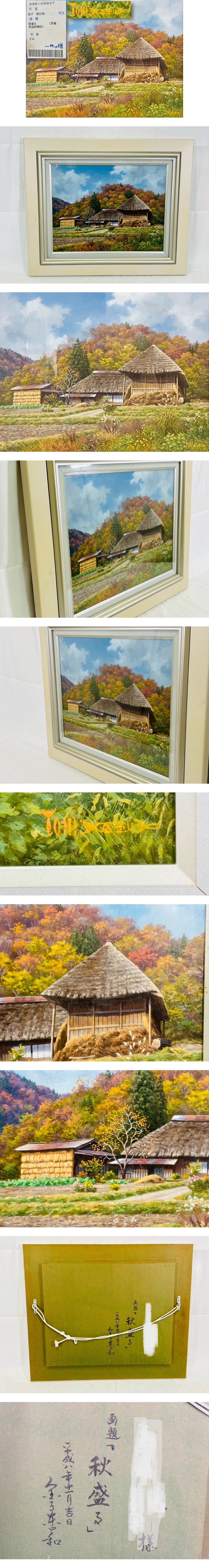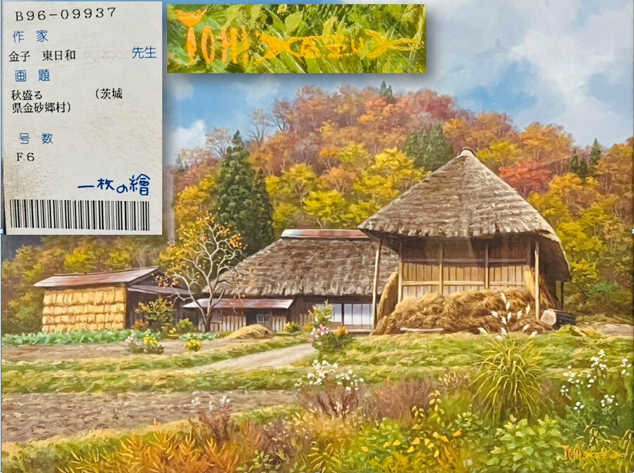 > 【真作】金子東日和「秋盛る(茨城県金砂郷村)」油彩 F6 一枚の絵 風景画 素朴な農村風景 絵画 茅葺古民家 インテリア 肉筆 直筆 サイン