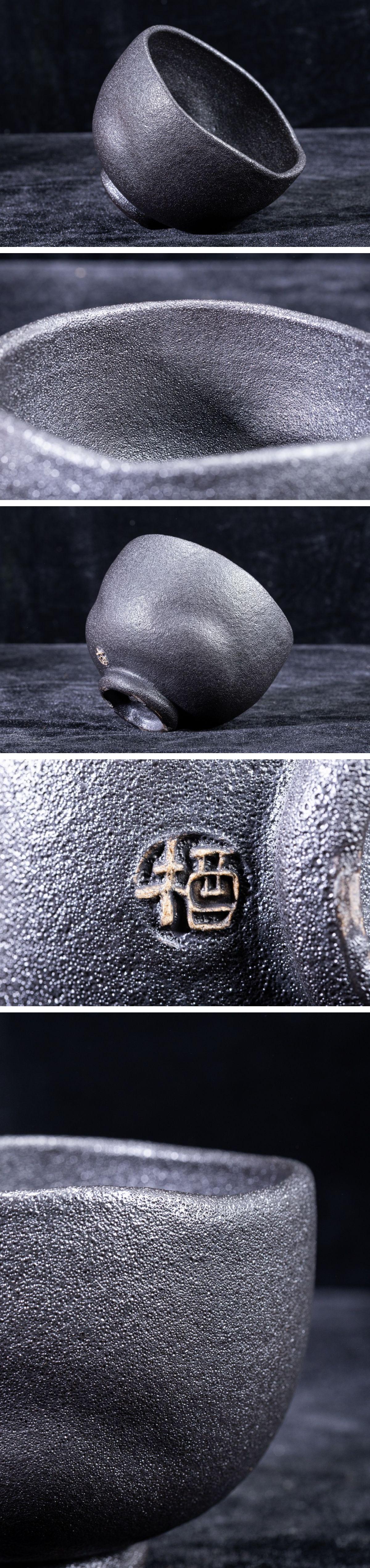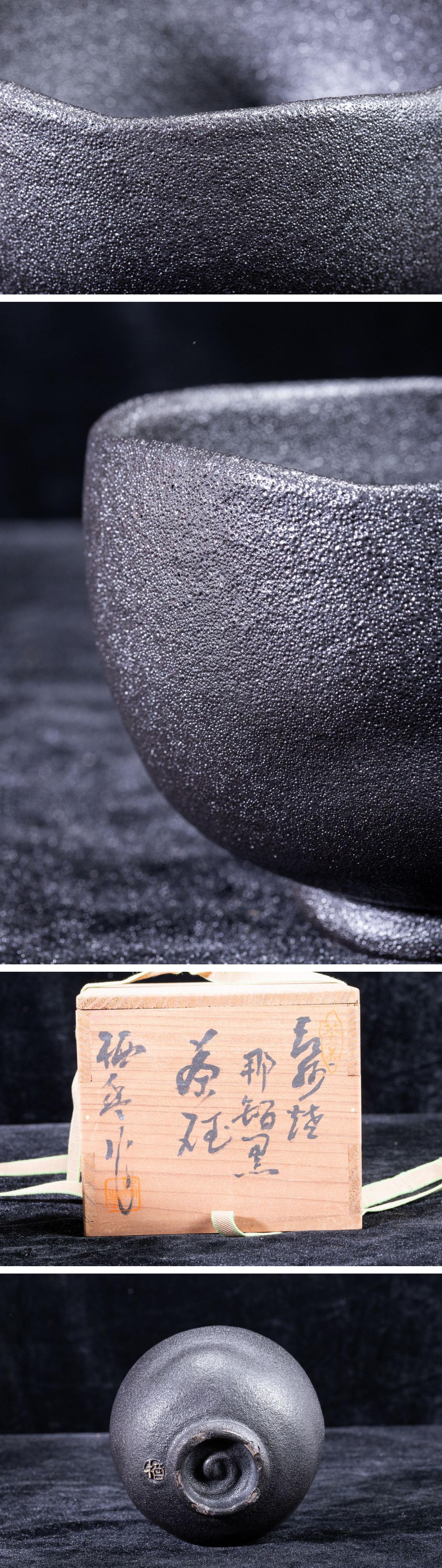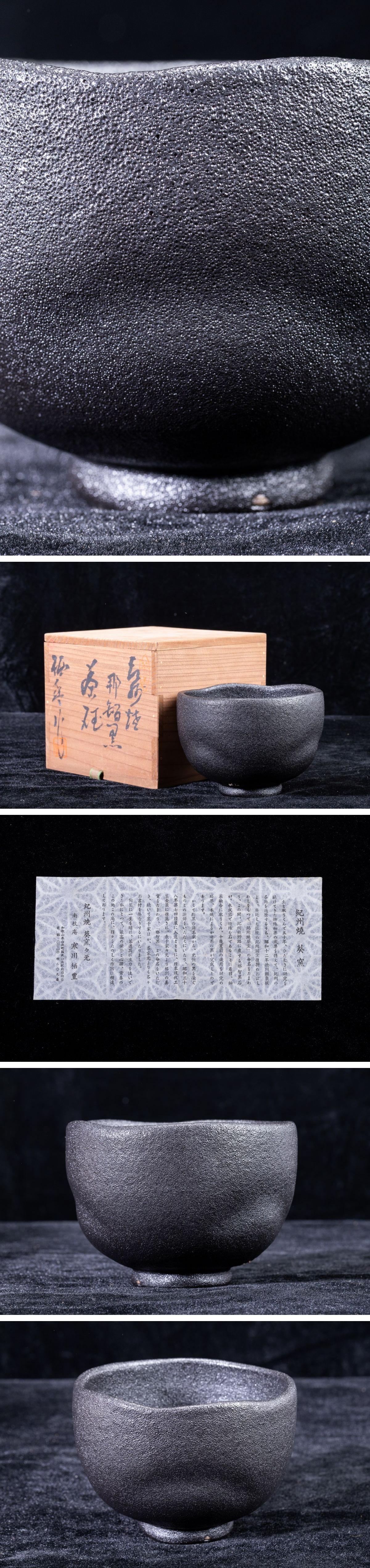 - 【珍品堂】1円から N55-V1 紀州焼 葵窯 寒川栖豊 作 在銘 那智黒 黒茶碗 高9.5㎝ 共箱 木箱 茶碗 茶道具 時代物 工芸品 骨董品 古美術