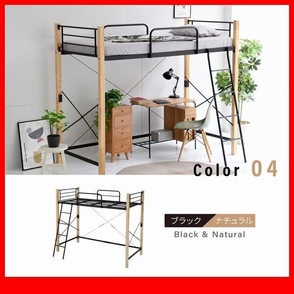 > ロフトベッド★天然木脚パイプベッド ロフトタイプ シングル/高級感 安心感 床下空間利用 メッシュ床/ブラックxナチュラル/a4