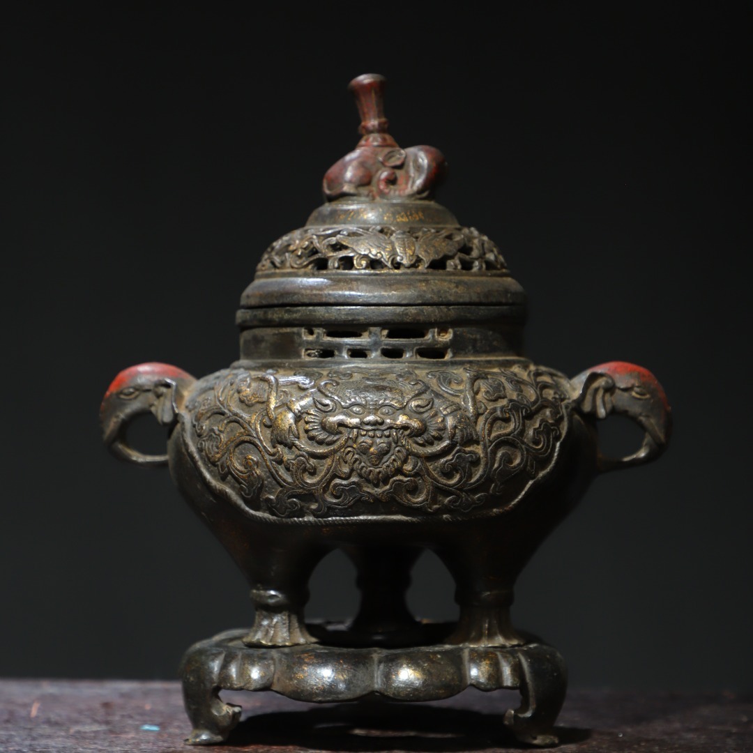 - 旧蔵 古銅彫 拓金 獅蓋 熏香炉 古擺件 古置物 中国古玩 骨董品 時代物 稀少唐物