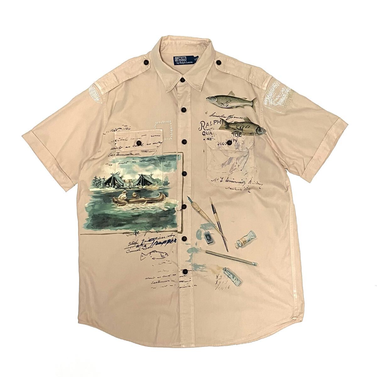 > L ポロ ラルフローレン フィッシング プリント シャツ ヴィンテージ リペア ヘミングウェイ 刺繍 ダメージ加工 釣り カーキ Polo Country