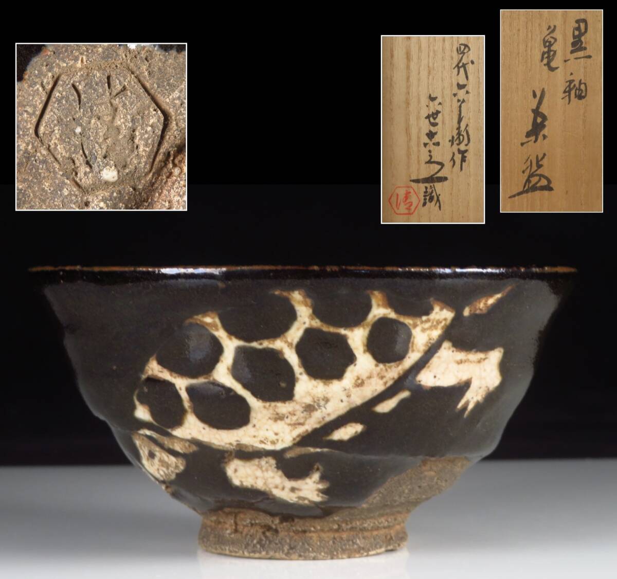 > 【SAKURAYA】秀逸作品【黒釉 亀 茶碗/京焼の名工 四代 清水六兵衛/六代 清水六兵衛 識箱】黒茶碗 茶道具 作家 共箱 時代 骨董品 古美術品