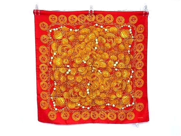 - 1円 ■美品■ CHANEL シャネル ココマーク シルク100% スカーフ ストール ショール レディース レッド系×ゴールド系 FT3408