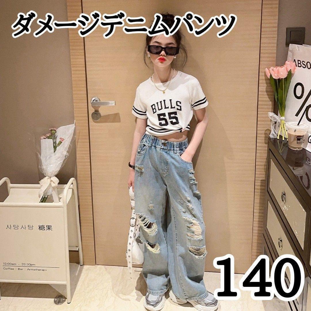 - ジーンズ ユーズド ワイドパンツ キッズ 140 ダンス ダメージ