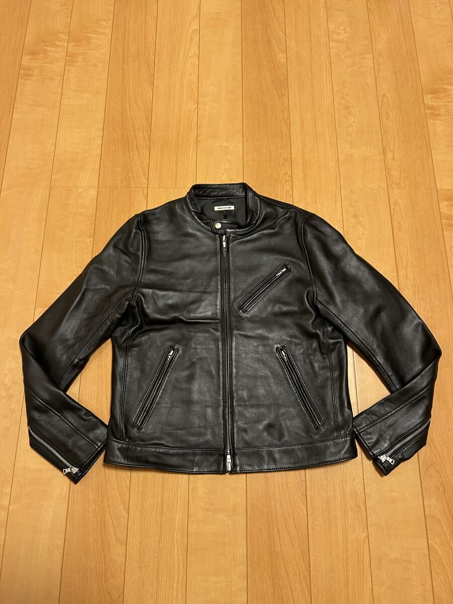 - 着用少な目.美品☆FREAK'S STORE/レディースサイズM 本革.羊革 ブラックラムレザージャケット シングル 襟無しスタンドカラー 真っ黒色系