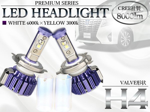 - 12V 24V LEDヘッドライト H4 ホワイト イエロー 切替可能 8000lm 3000k 6500k 白 黄色 ガラス管 一体型 オールインワン