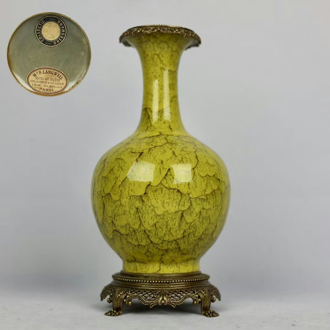 - ▼渡鶴羽▼A0749清時代 黄釉窯変釉象嵌銅辺賞瓶・古陶磁器 ・珍品旧蔵・古賞物・時代物