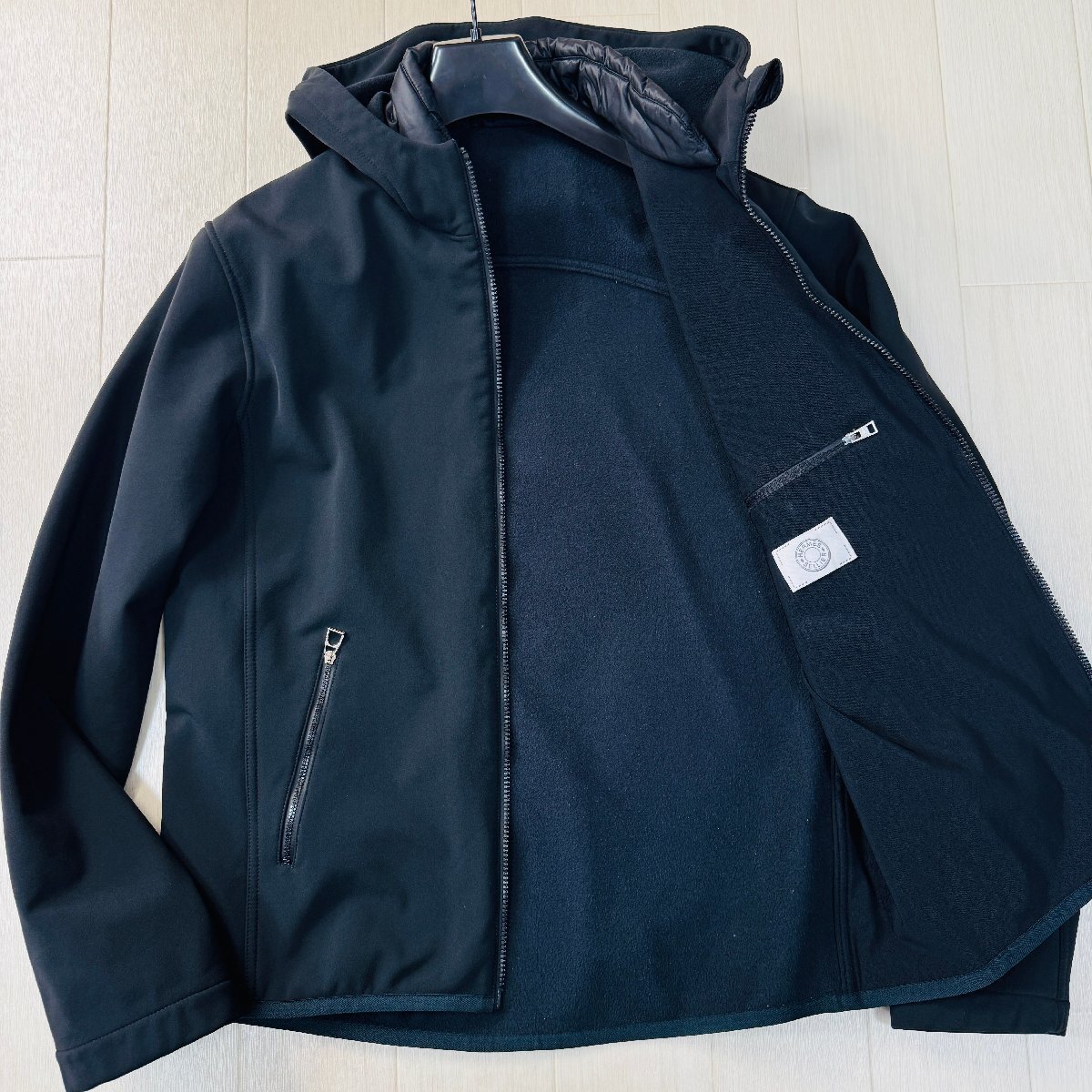 > 良品/XL相サイズ★エルメス HERMES ストレッチナイロン フーデットジャケット パーカー 裏起毛フリース 軽アウター ロゴ金具 メンズ 黒