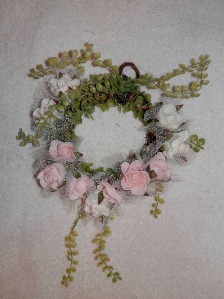 - ハンドメイド ピンク・ホワイトローズ11個付きリース(17cm)