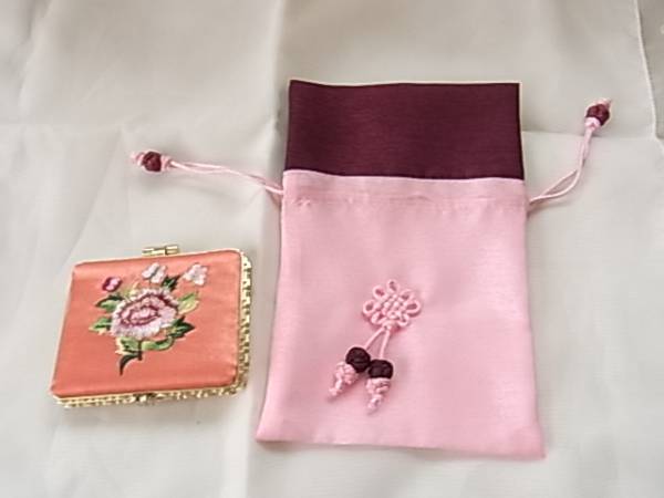 - 刺繍が美しいコンパクトミラーと専用巾着袋のセット 韓国土産