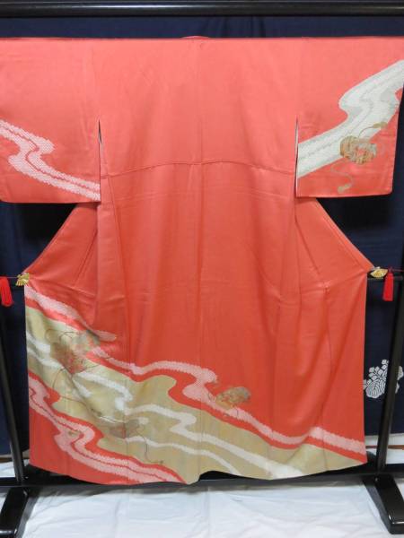 - 【桐輪】訪問着☆流水.小箱☆送料無料☆逸品物*美品{正絹*袷仕立*訪問着}*身丈156-裄63*潤朱色地*手絞り.金彩加工の流水と小箱*№3421775